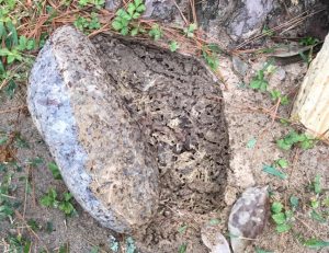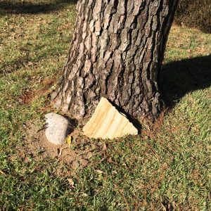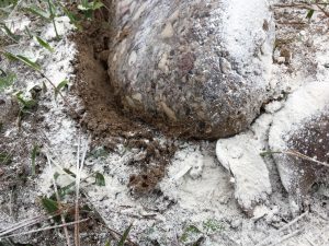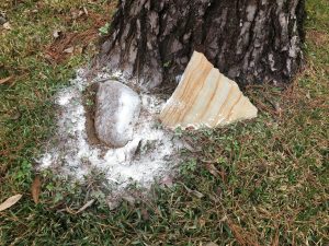 There was a fairly large pile of fire ants at the base of a pine tree in the yard. This pile could easily be seen and therefore ignored since Fire Ants don’t tend to attack unless a person disrupts them. However if you have children running around the yard and using the tree as “base” it is time for the fire ants to go!